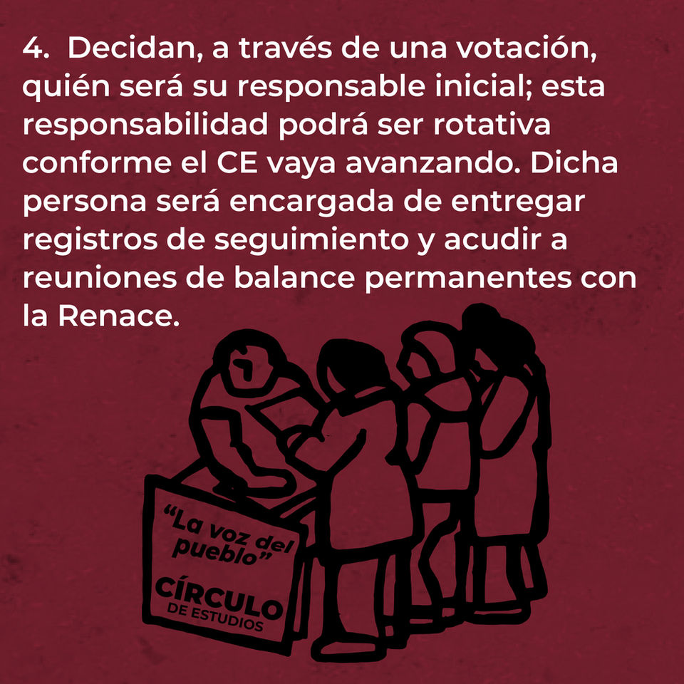 4.- Decidan, a través de una votación, quién será su responsable inicial; esta responsabilidad podrá ser rotativa conforme el CE vaya avanzando. Dicha persona será encargada de entregar registros de seguimiento y acudir a reuniones de balance permanentes con la Renace.